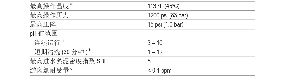 1 產(chǎn)水量和脫鹽率(NaCl)基于以下標(biāo)準(zhǔn)測(cè)試條件:2,000 ppm NaCl, 225 psi (15.5 bar), 77ºF (25ºC), pH8,15%回收率