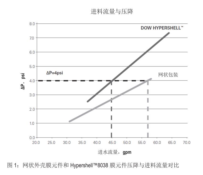 FilmTec™ Hypershell™ 元件的外部旁路較少,在同等壓降下需要的進水流量比網(wǎng)狀外殼膜元件低 30% 左右。下圖為 4psi 壓降下兩種膜元件的流量對比圖。通過減少流量可降低能耗