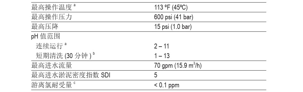 1 產水量和脫鹽率(NaCl)基于以下標準測試條件:2,000 ppm NaCl, 225 psi (15.5 bar), 77ºF (25ºC), pH8,15%回收率