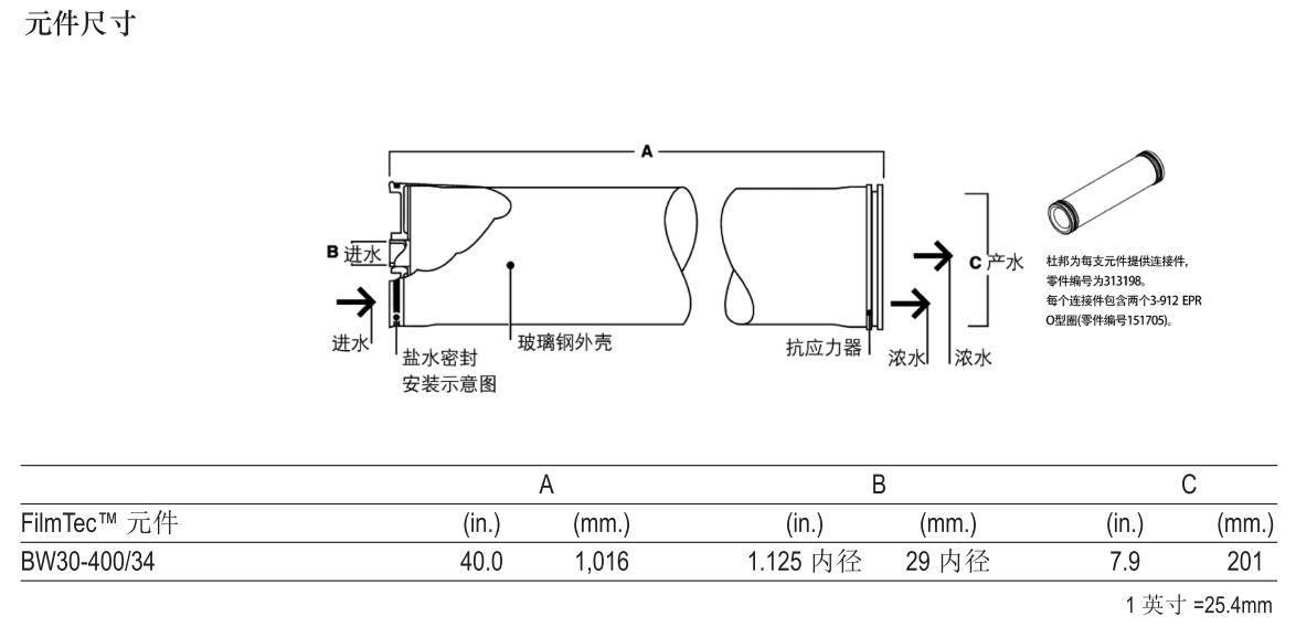 ● 膜元件配合公稱內(nèi)徑為8英寸(203mm)的壓力容器