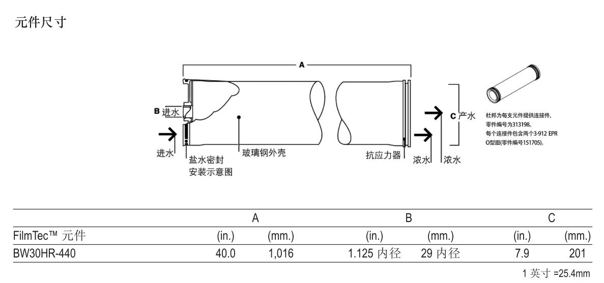 ● 膜元件配合公稱內(nèi)徑為8英寸(203mm)的壓力容器