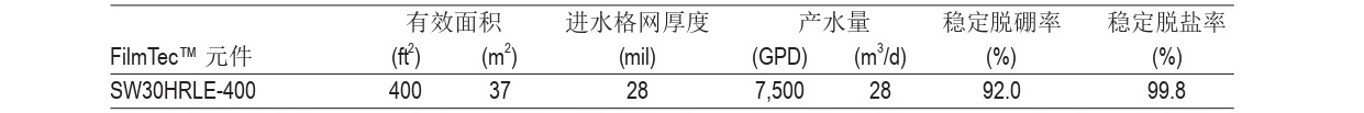 1 產(chǎn)水量和脫鹽率基于以下標(biāo)準(zhǔn)測(cè)試條件:32,000ppm NaCl,5ppm硼, 800psi (5.5 MPa), 77ºF (25ºC), pH8,8%回收率
