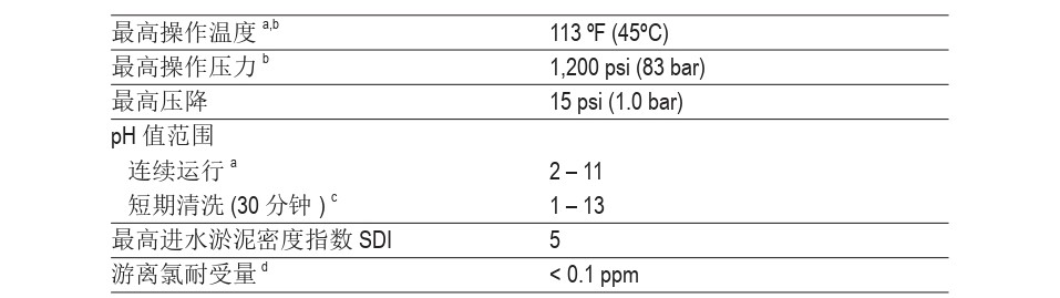 ● b 溫度超過 95ºF (35ºC) 的應(yīng)用請(qǐng)咨詢杜邦代表獲取建議。質(zhì)保無效情況和更多信息請(qǐng)參考FilmTec™元件操作限制(文件號(hào)45-D00691-en)