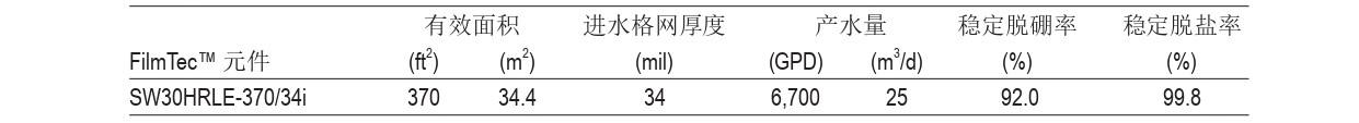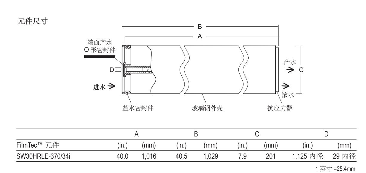 1 產(chǎn)水量和脫鹽率基于以下標(biāo)準(zhǔn)測試條件:32,000ppm NaCl,5ppm硼, 800psi (5.5 MPa), 77ºF (25ºC), pH8,8%回收率