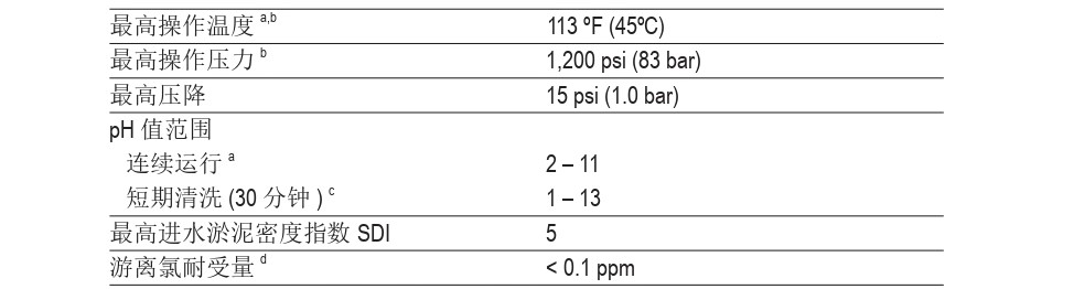 b 溫度超過 95ºF (35ºC) 的應(yīng)用請咨詢杜邦代表獲取建議。質(zhì)保無效情況和更多信息請參考 FilmTec™ 元件操作限制(文件號45-D00691-en)