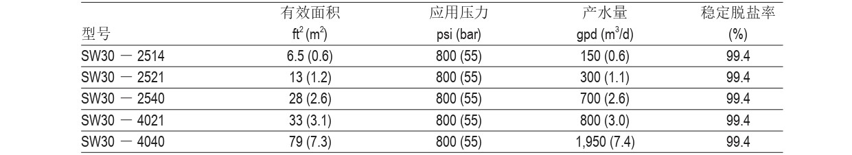 產(chǎn)水量和脫鹽率基于以下測(cè)試條件:32,000ppm NaCl,上表所述壓力,77ºF(25ºC),SW30-2514 回收率2%, SW30-2521&SW30-4021 回收率5%, SW30-2540&SW30-4040 回收率8%