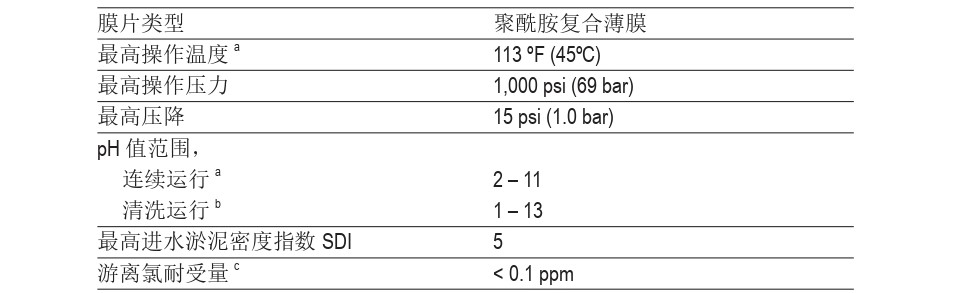 c 在某些條件下,游離氯和其他氧化劑的存在會(huì)導(dǎo)致膜片過(guò)早失效。由于氧化損壞不在質(zhì)保范圍內(nèi),杜邦水處理解決方案建議用戶在殘余游離氯接觸膜片之前通過(guò)預(yù)處理將其去除。 更多信息請(qǐng)參考進(jìn)水脫氯(文件號(hào) 45-D01569-en)