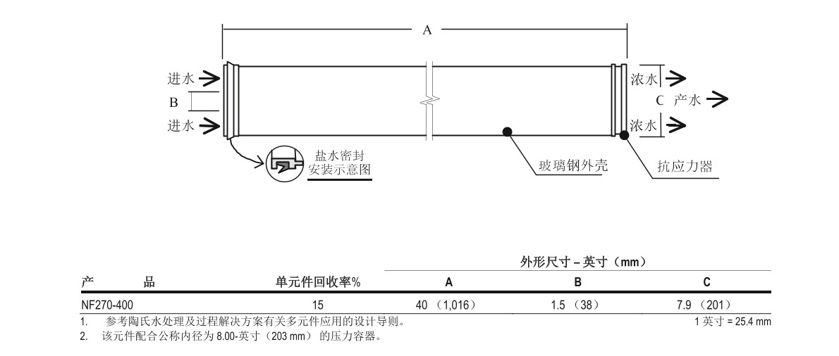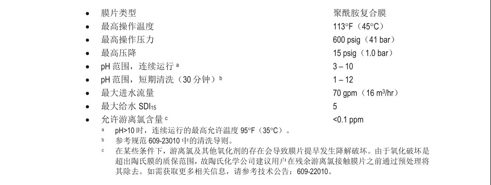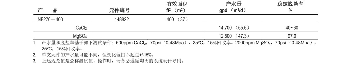 FILMTEC™ NF270-400納濾膜元件面積大,產(chǎn)水量高。是專門為了高度脫除總有機(jī)碳(TOC)和三鹵代烷(THM)前驅(qū)物而開發(fā)的產(chǎn)品,同時允許硬度成份中等通過,其它鹽分中等或較高程度通過。