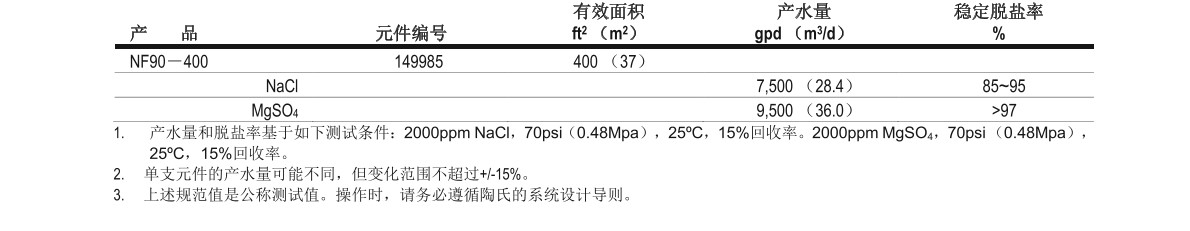 NF90-400膜面積大,所需凈驅(qū)動壓低,使得它在很低的運行壓力下就可有效地 脫除這些雜 質(zhì)