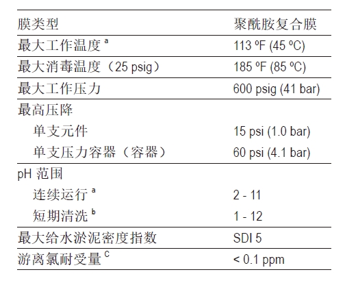 c 在某些條件下,游離氯和其他氧化劑的存在會導(dǎo)致膜片過早失效。由于氧化損壞不在質(zhì)保范圍內(nèi),杜邦水處理解決方案建議用戶在殘余游離氯接觸膜片之前通過預(yù)處理將其去除。 更多信息請參考進(jìn)水脫氯(文件號 45-D01569-en)
